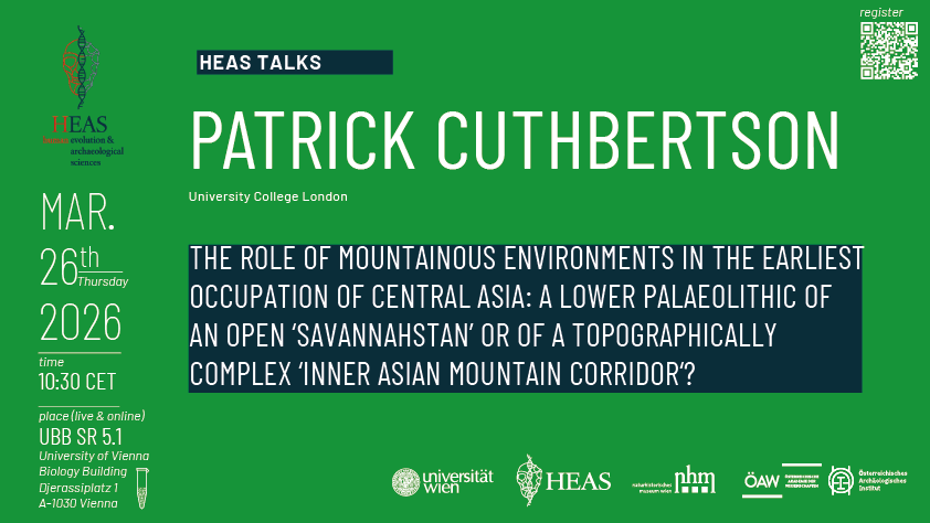 We are looking forward to welcoming Patrick Cuthbertson from University College London to Vienna for a HEAS Talk on The role of mountainous environments in the earliest occupation of Central Asia: A Lower Palaeolithic of an open ‘Savannahstan’ or of…