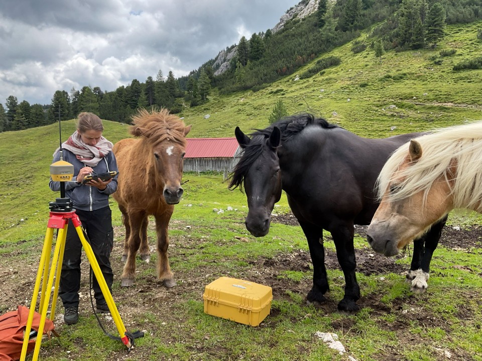 (Setup of a GPS-antenna for the measurement of outlines and other important geo-points during the excavation on the Grafenbergalm, Austria, visited by some very nosy locals.)