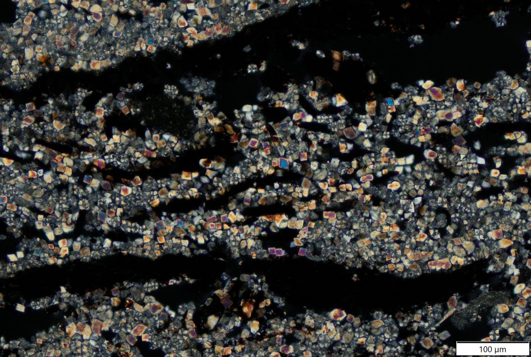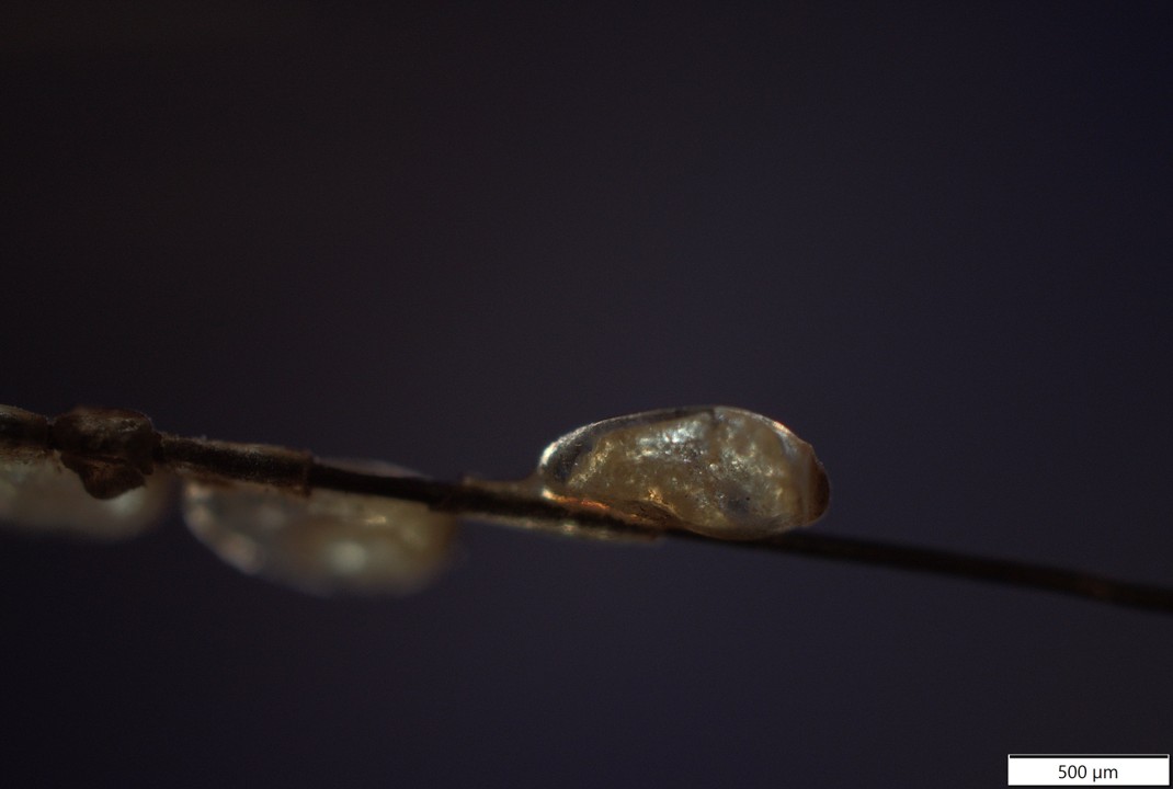 Michelle Hämmerle – The photo is showing louse nits from the species Pediculus humanus americanus on the head of a 500-year old Inca mummy, from which we extracted both host louse DNA and DNA of the bacterium Bartonella quintana. The picture was taken using cross-polarized light at 400× magnification.