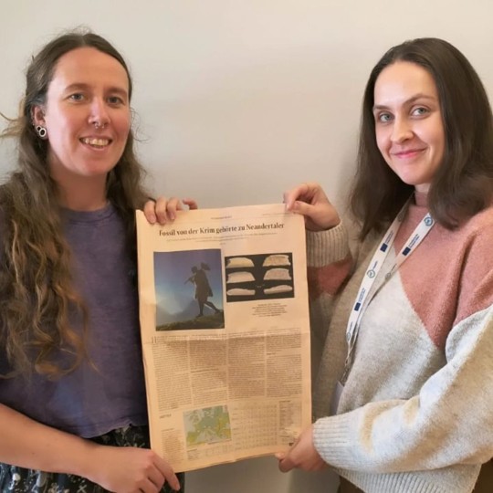 Emily Pigott and Konstantina Cheshmedzhieva (Ina) holding our newspaper article in, „Der Standard“ from our recent paper in PNAS, entitled – A new late Neanderthal from Crimea reveals long-distance connections across Eurasia
