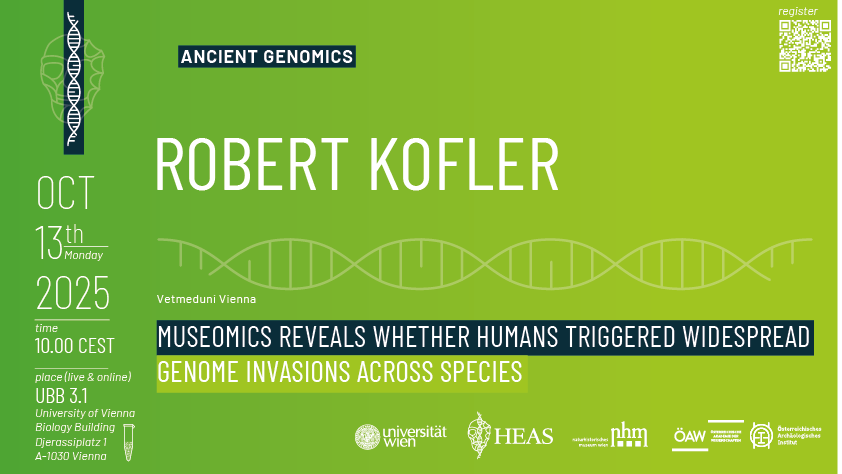 As part of the HEAS Seminar Series in Ancient Genomics, Robert Kofler from Vetmeduni Vienna will give a talk on Museomics reveals whether humans triggered widespread genome invasions across species on the 13th October 2025 at 10:00 in SR 3.1 at the University of Vienna Biology Building (UBB).
