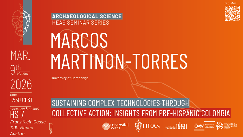 As part of the HEAS Seminar Series in Archaeological Science, Marcos Martinon-Torres from the University of Cambridge will give a talk on Sustaining complex technologies through collective action: insights from pre-Hispanic Colombia on the 9th March 2026 at 12:30 in HS7 Franz Klein Gasse 1190 Vienna.